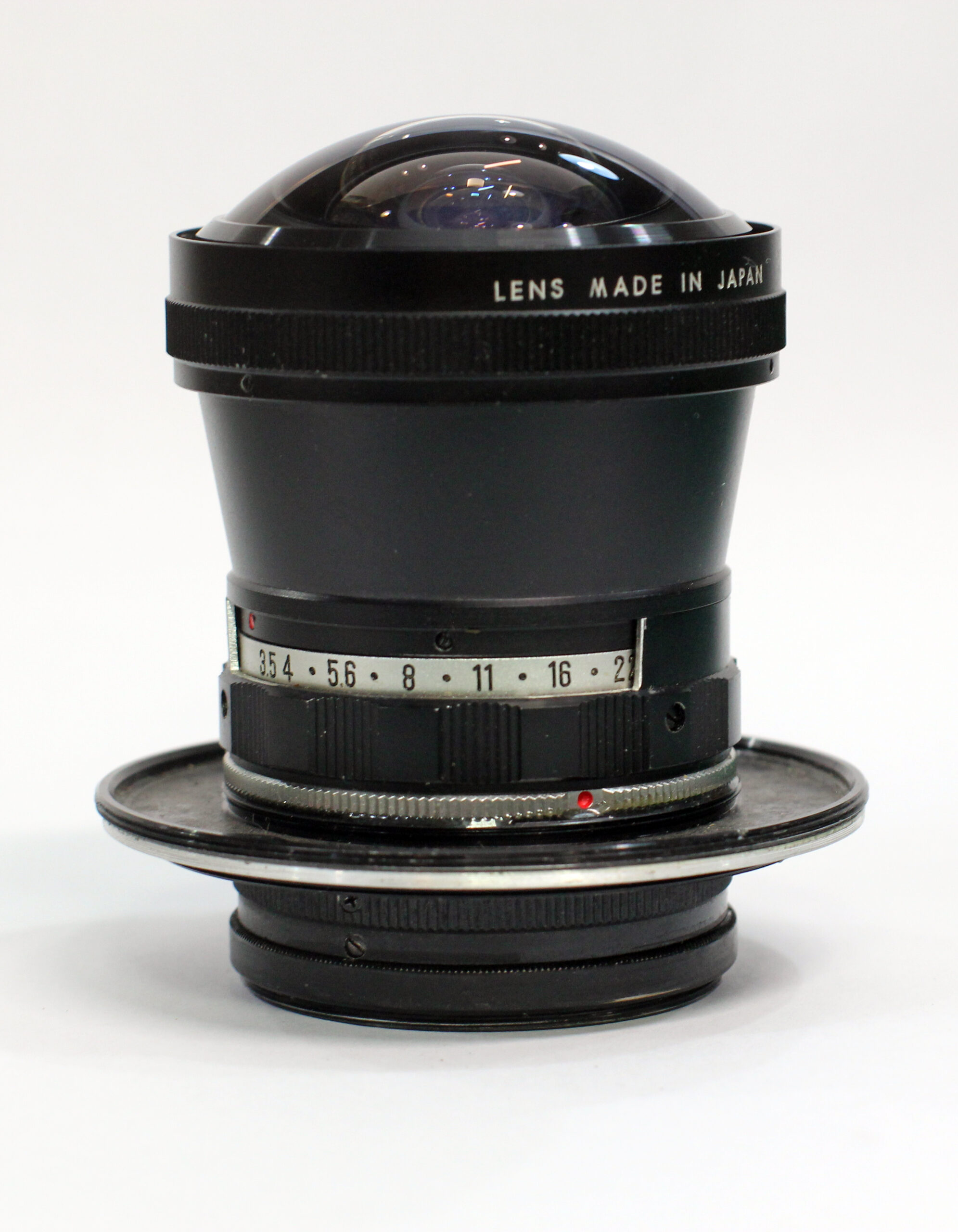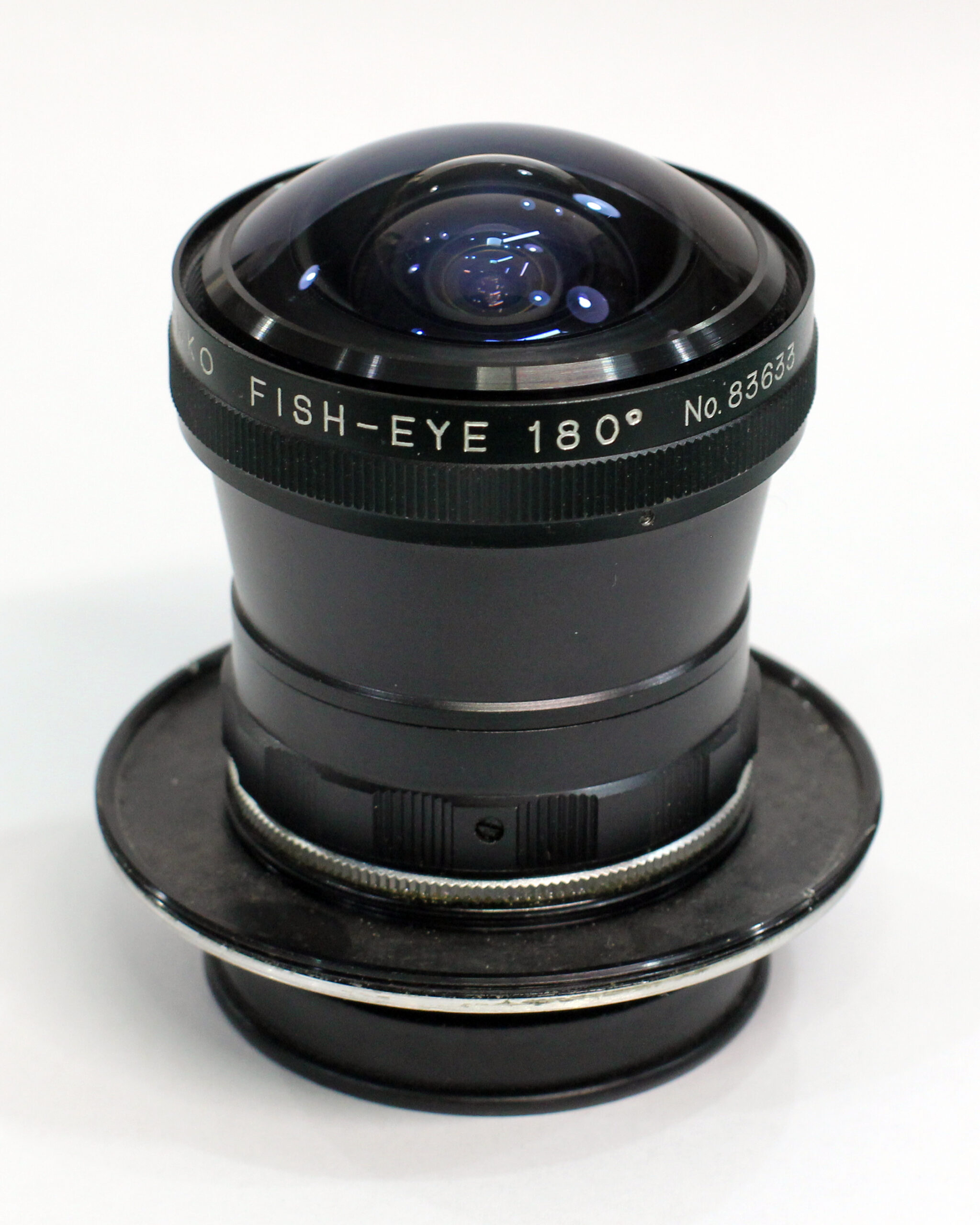 This vintage Fish-Eye 180° lens is a distinctive and hard-to-ignore piece of photographic gear, featuring a large bulbous front element and solid old-school metal build.